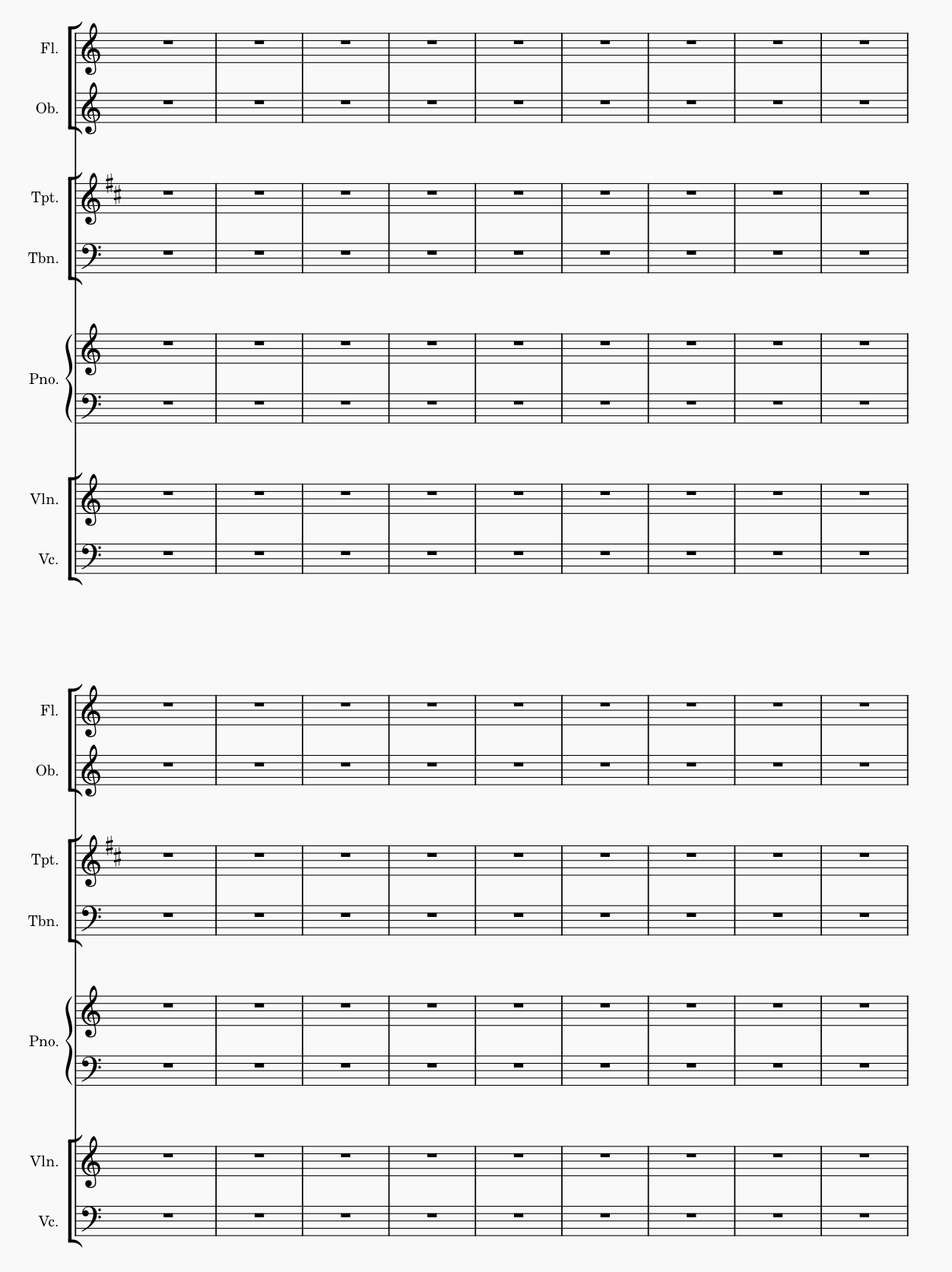 When **Enable vertical justification of staves** is selected, MuseScore will do its best to space staves across the page, filling all the space. It tries to create even space between staves but can also create proportionally more space between systems and between instrumental sections within systems. The three **Factor** settings control this behaviour. This is best shown by an example: