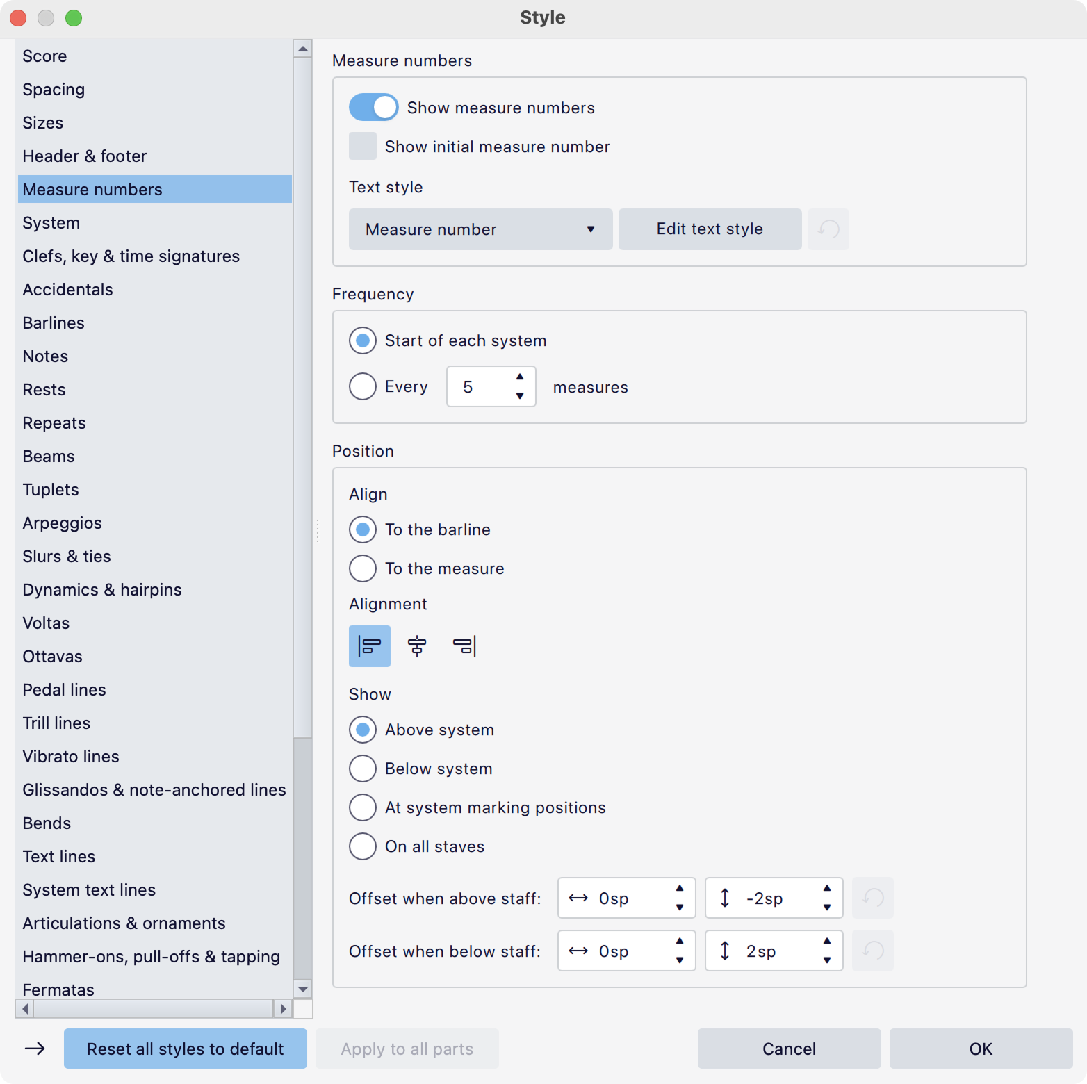 * **Text style:** Which text style to use for measure numbers. 'Measure number' is the default, but there is also a 'Measure number (alternate)' style provided so that you can quickly switch between two different styles. You can also choose any other style from the dropdown, or define your own.