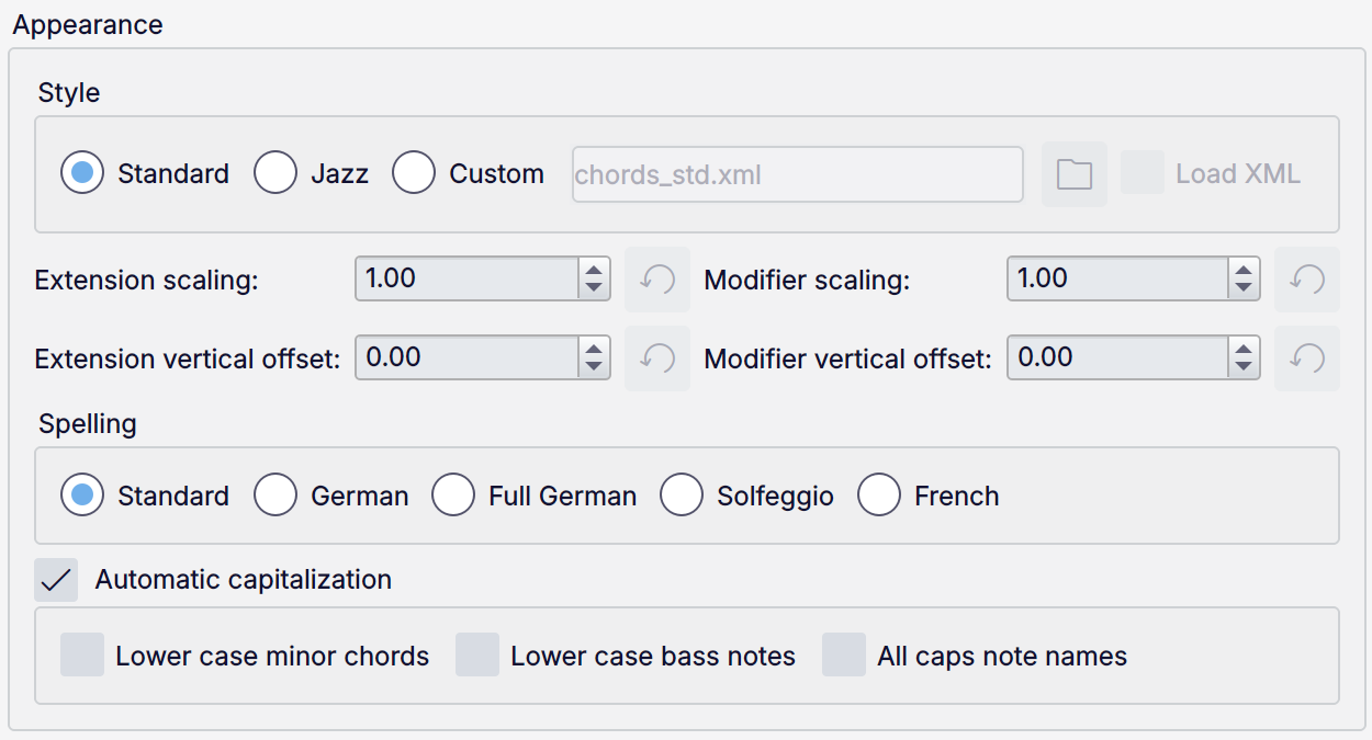 This determines how chord symbols are rendered. It affects all chord symbols in the score and cannot be overridden for a specific item.