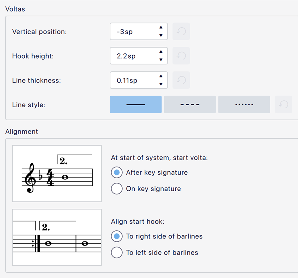 * **At start of system, start volta:** This controls whether the vertical hook should start after or on the key signature. Note that this affects also affects the continuation of a volta line when it continues to a new system.