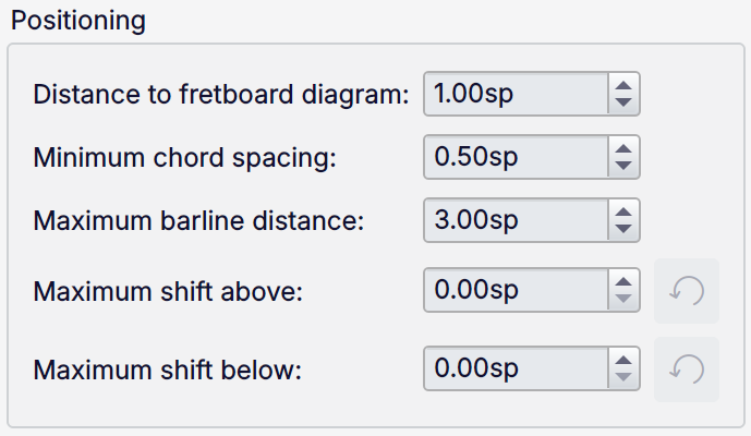 * **Suurin siirtymä ylös/alas**: suurin etäisyys, jonka verran sointumerkkiä voidaan siirtää ylös- tai alaspäin, jotta se on linjassa edellisen sointumerkin kanssa järjestelmässä. Jos nämä on asetettu arvoon 0, symbolit eivät ole linjassa; jos haluat pakottaa kaikki sointujärjestelmät linjaamaan järjestelmässä, aseta tämä arvo suureksi.