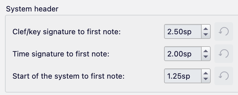 Finally, there are some settings for spacing of the **System header**, which is the space on a system before the first note or rest, usually containing the clef and possibly the key signature and time signature.