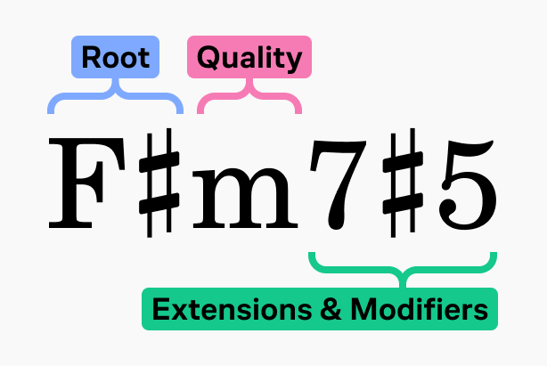 * **Extensions & modifiers**: Other alterations to the chord (7, sus, no 3, etc.).