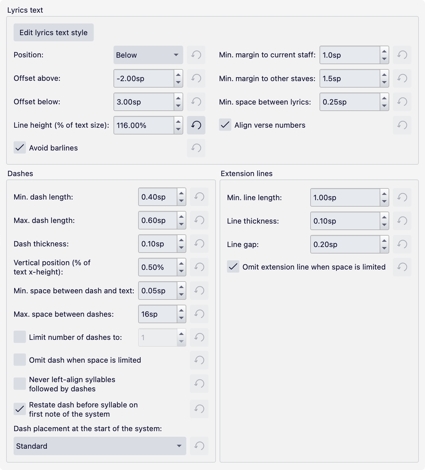 **Format -> Style -> Lyrics** controls many settings to specify the layout and appearance of lyrics, some of which are very nuanced.