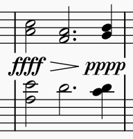 This includes all the standard dynamics symbols (***p***, ***mf***, ***ff***, etc.) as well as gradual dynamic changes in the form of hairpins:
