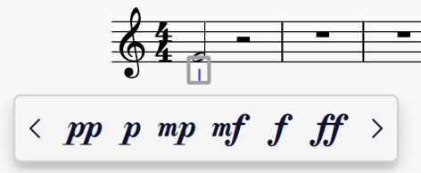 3. Click on a dynamic in the popup, or type it directly (e.g. `pp` or `mf`, etc.) and then press `Esc` or click on a blank area of the score, whereupon the text, if valid, will convert to a dynamic symbol.
