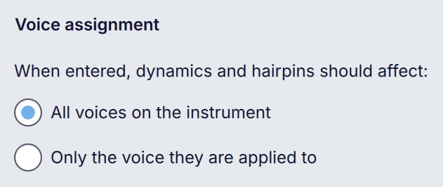 * **Voice assignment**: to which voice the selected dynamic is assigned; this can affect both its position and also [playback](#dynamics-and-playback); the default is **All** (see [Assigning dynamics to voices](#assigning-voices-to-dynamics), below)