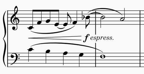 Where a dynamic is followed by an expressive marking, for example ***p** dolce* or ***f** espress.*, it is best to input the dynamic and the expression text as separate items. The two will automatically snap together (see [Snapping and alignment](#snapping-and-alignment)).