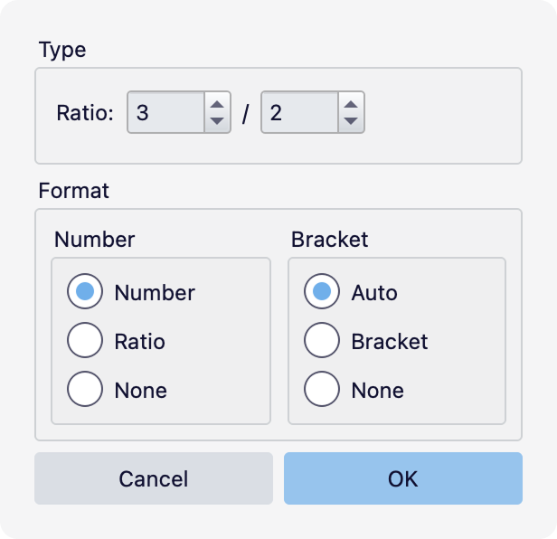 * **Number type:** Whether to show just the number of divisions (e.g. '3'), the explicit ratio (e.g. '3:2'), or no number.